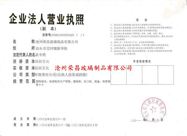 我公司全稱滄州榮昌玻璃制品有限公司,始建于1985,公司注冊資金500萬元,坐落于河北省省級開發區-泊頭市開發區,是滄州地區唯一在省級開發區建廠的玻璃制品企業,公司占地面積50余畝,標準化廠房15000平方米。現有員工300余人,其中工程技術人員210人。
